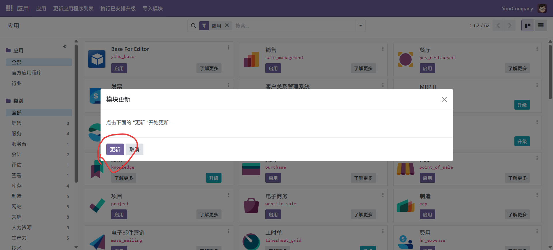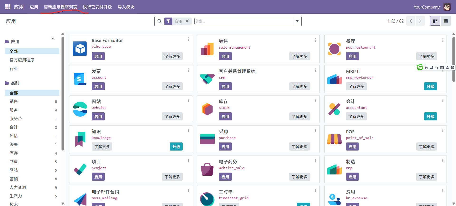 将第三方模块放到此目录。模块放置完成以后,重启odoo,然后更新模块列表