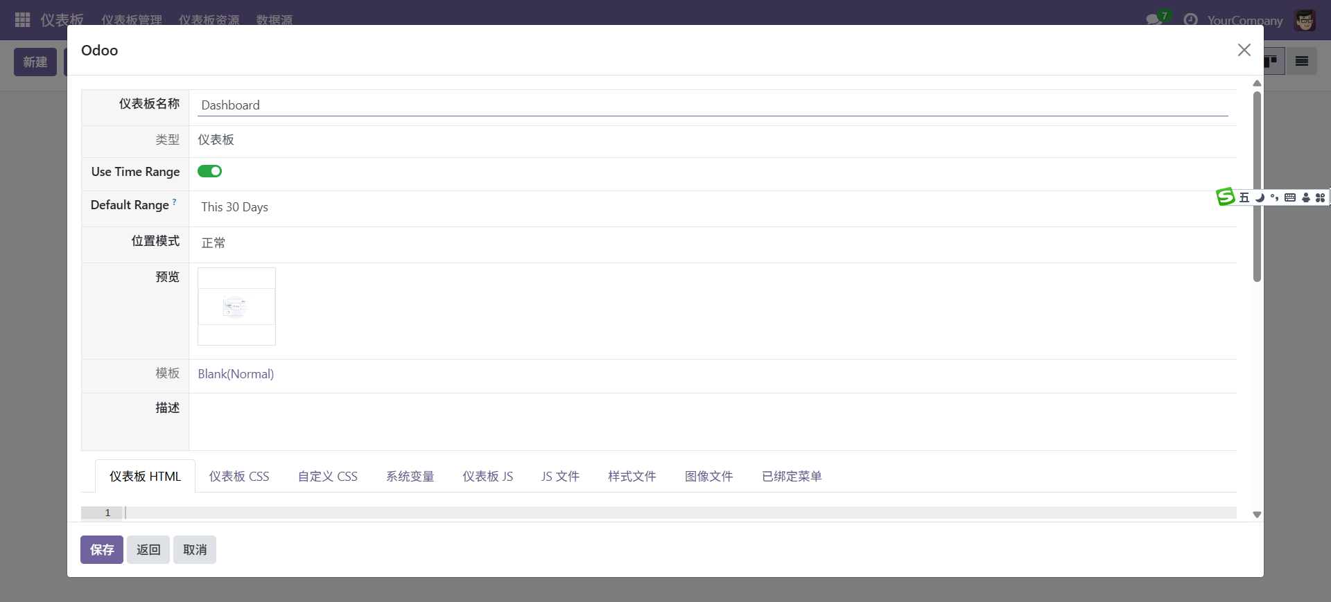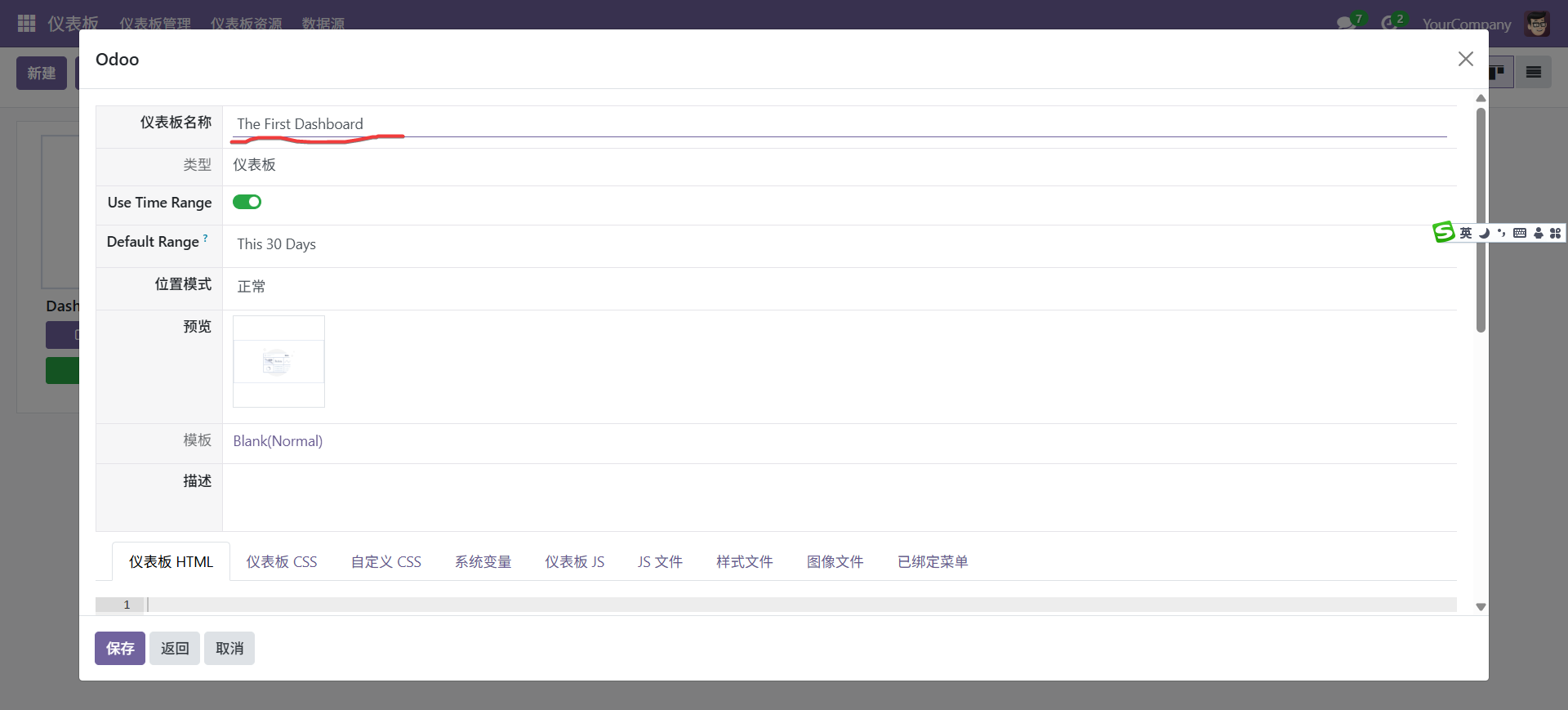 其它仪表板HTML等为系统自带的模板信息,一般情况下不用修改,只有特殊诉求时才需要进行更改,如因为错误操作导致无法进入看板等,可以在这里个复以后再进入,仪表板CSS等只有需要自定义一些特殊样式才需要在这里添加,其它一些信息也是为了让用户知道相关内容,一般情况下不需要填写。点击保存。