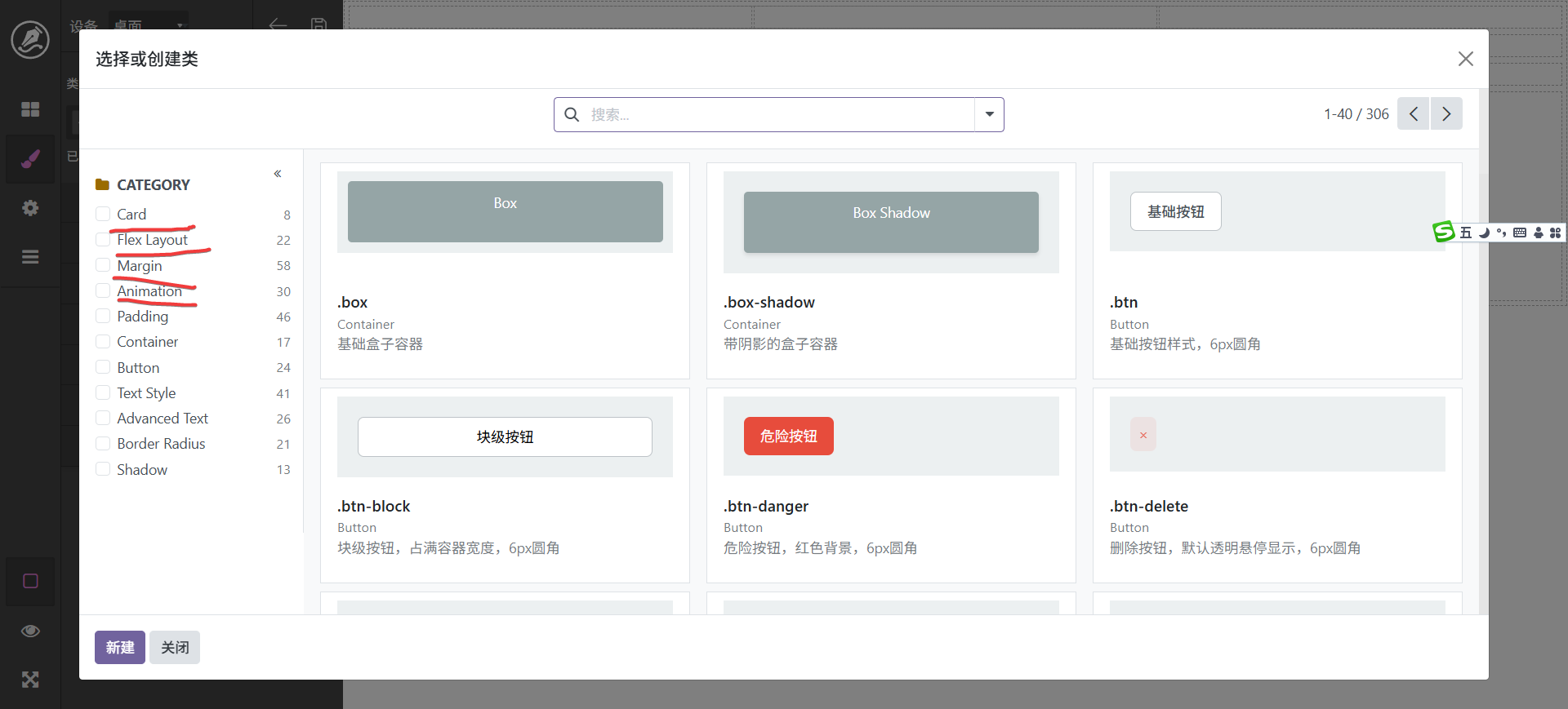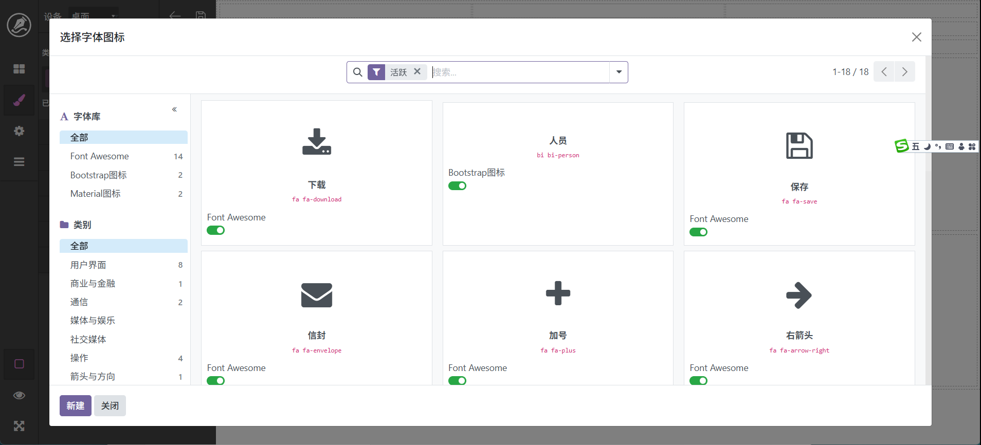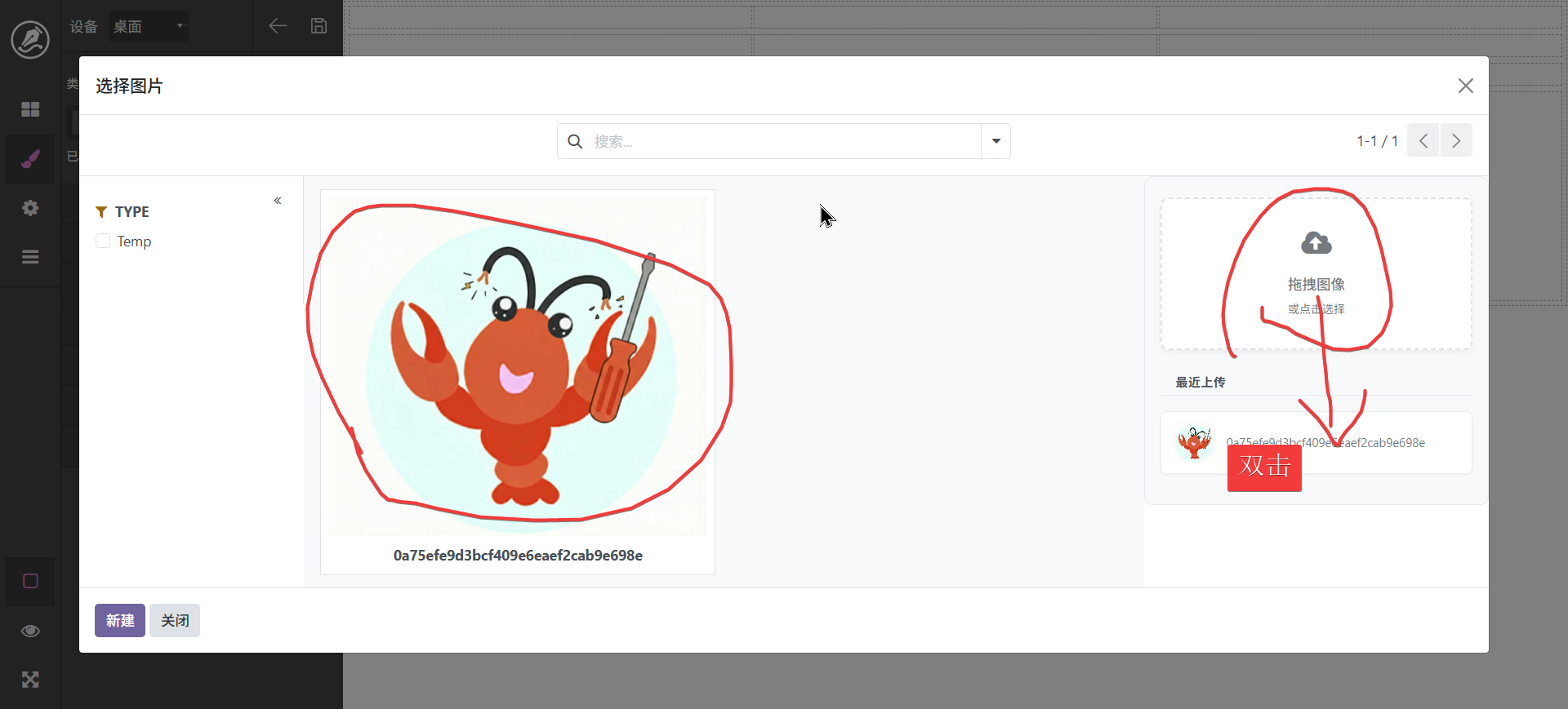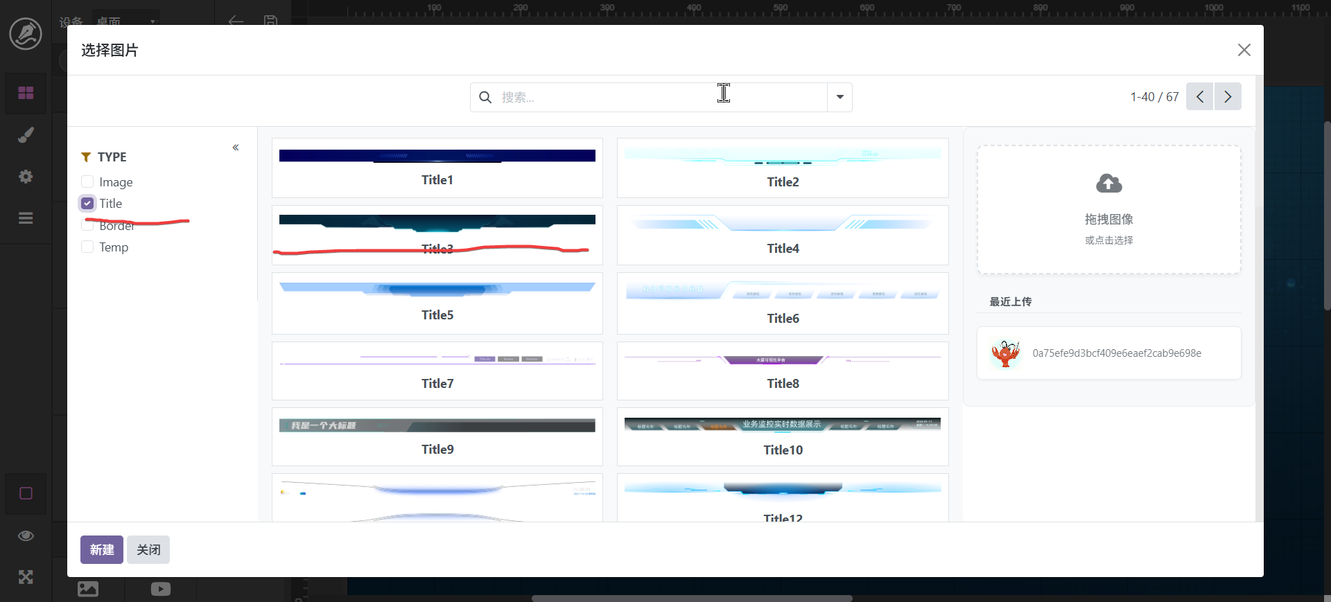 拖动图像进入编辑区会自动弹出图像选择框,左侧为分类筛选,可以点击选择图像,如果没有自己需要的图像也可以在右侧上传后选择
