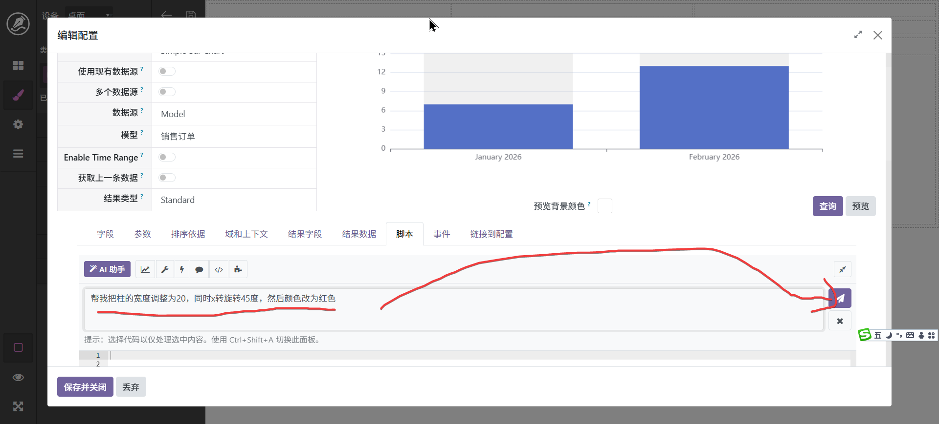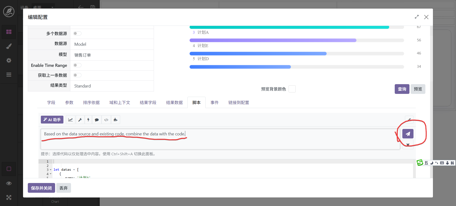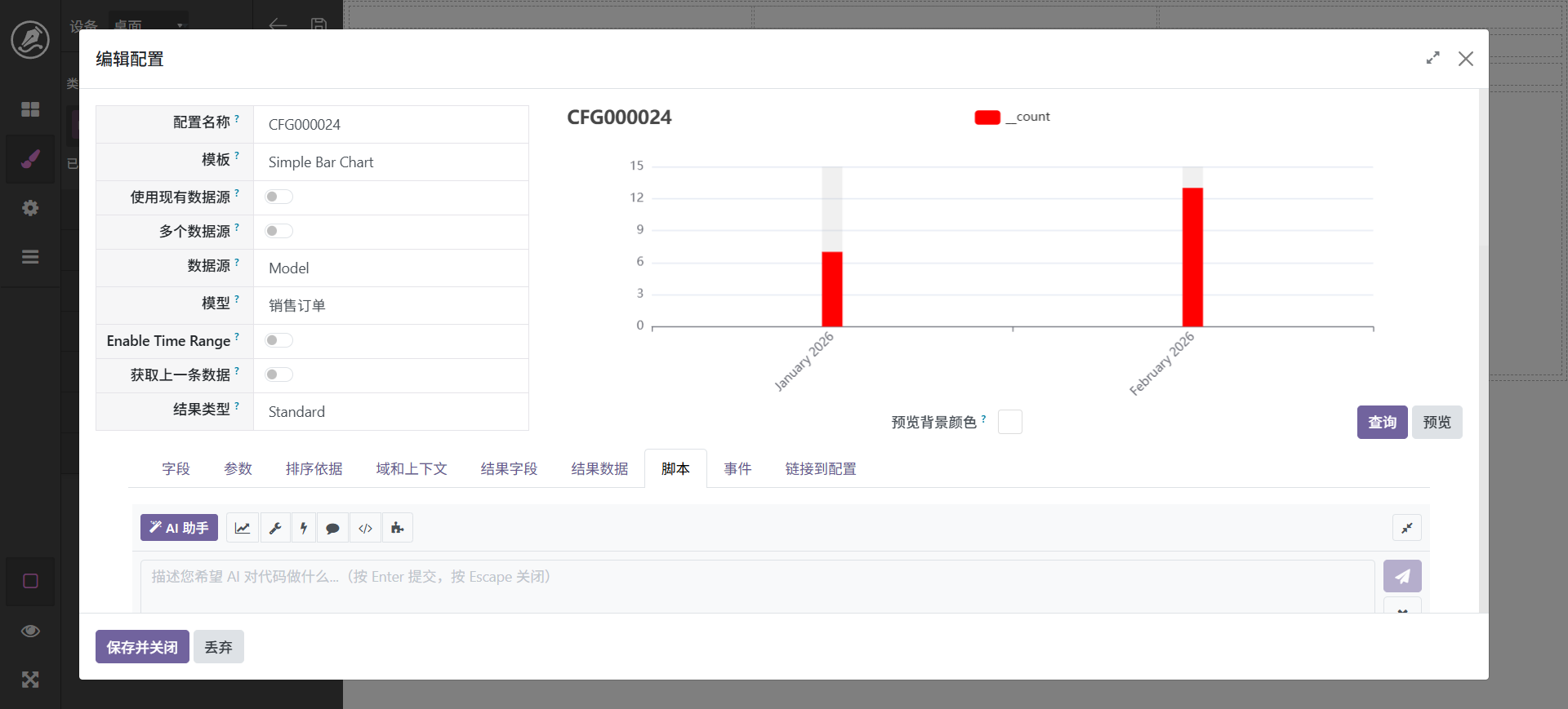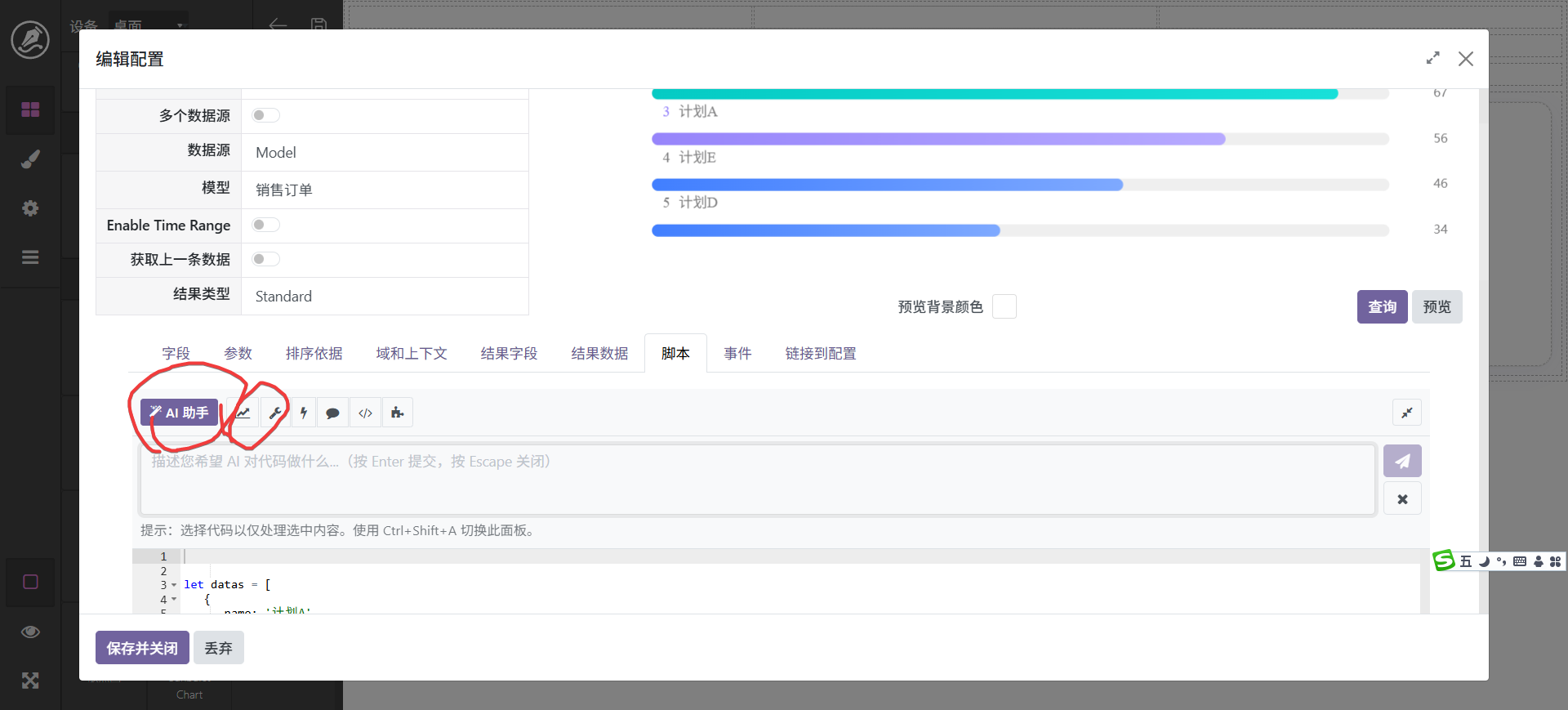 图表是看板中的重要组成部份,我们支持多种图表,大体分为系统固定图表和自定义图表,具体区别为,固定图表已经将脚本模式化,自定义图表需要将数据绑定到脚本,不过有ai辅助其实很简单,具体操作步骤如下: