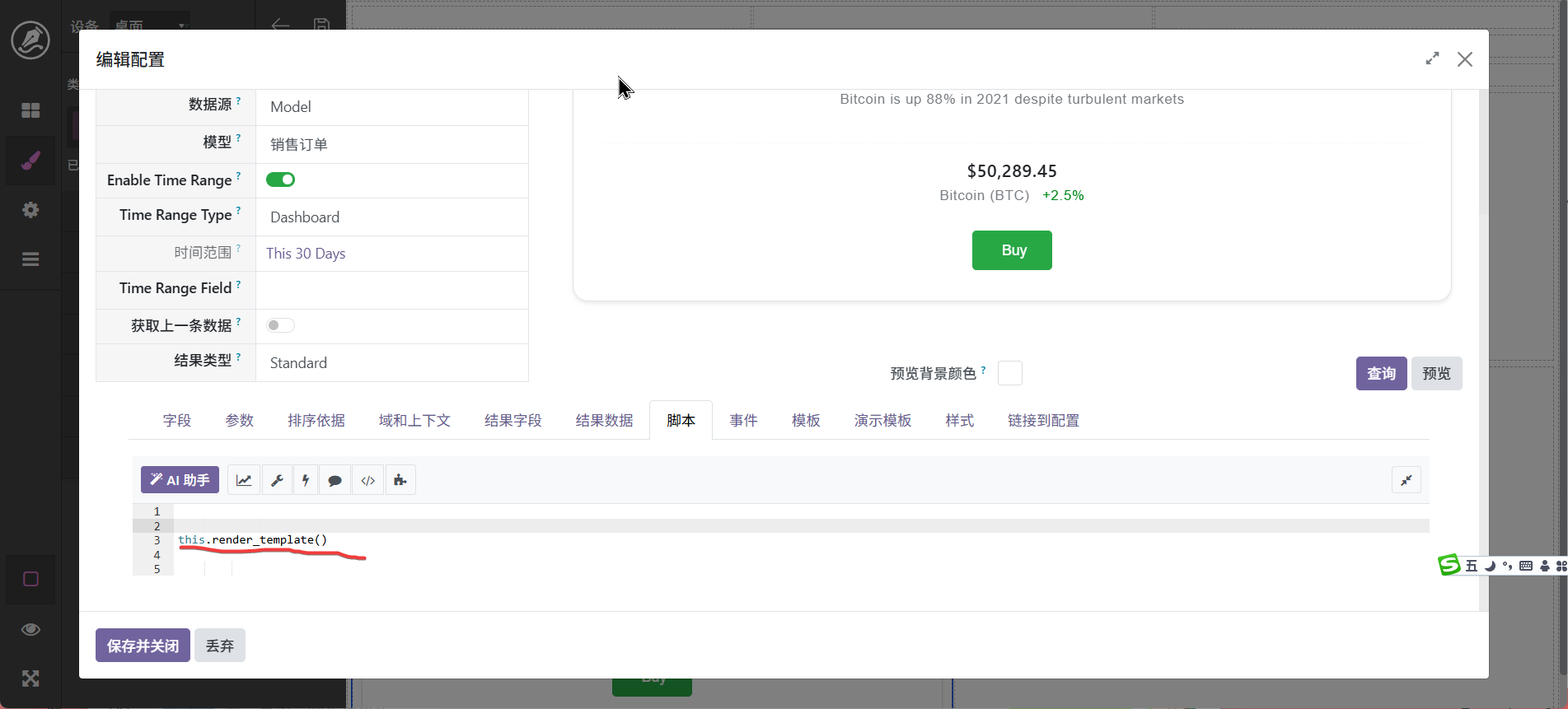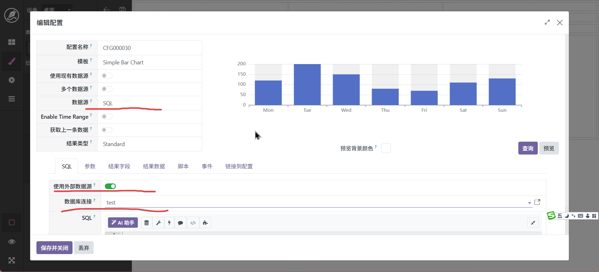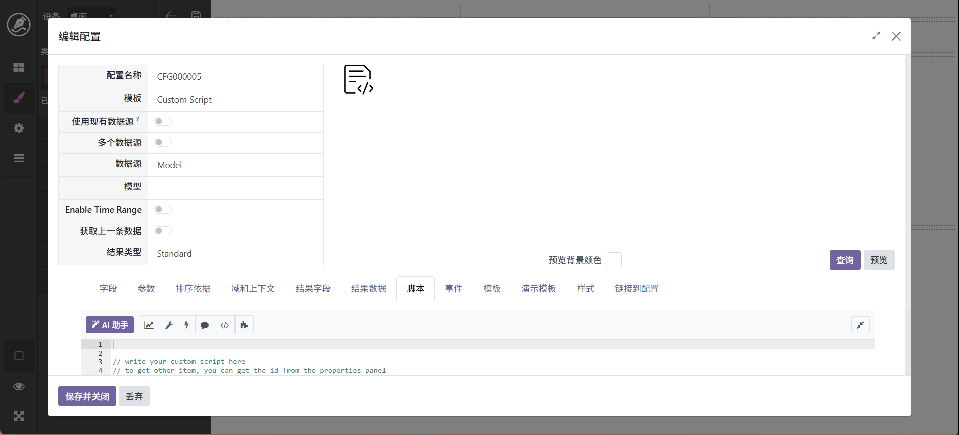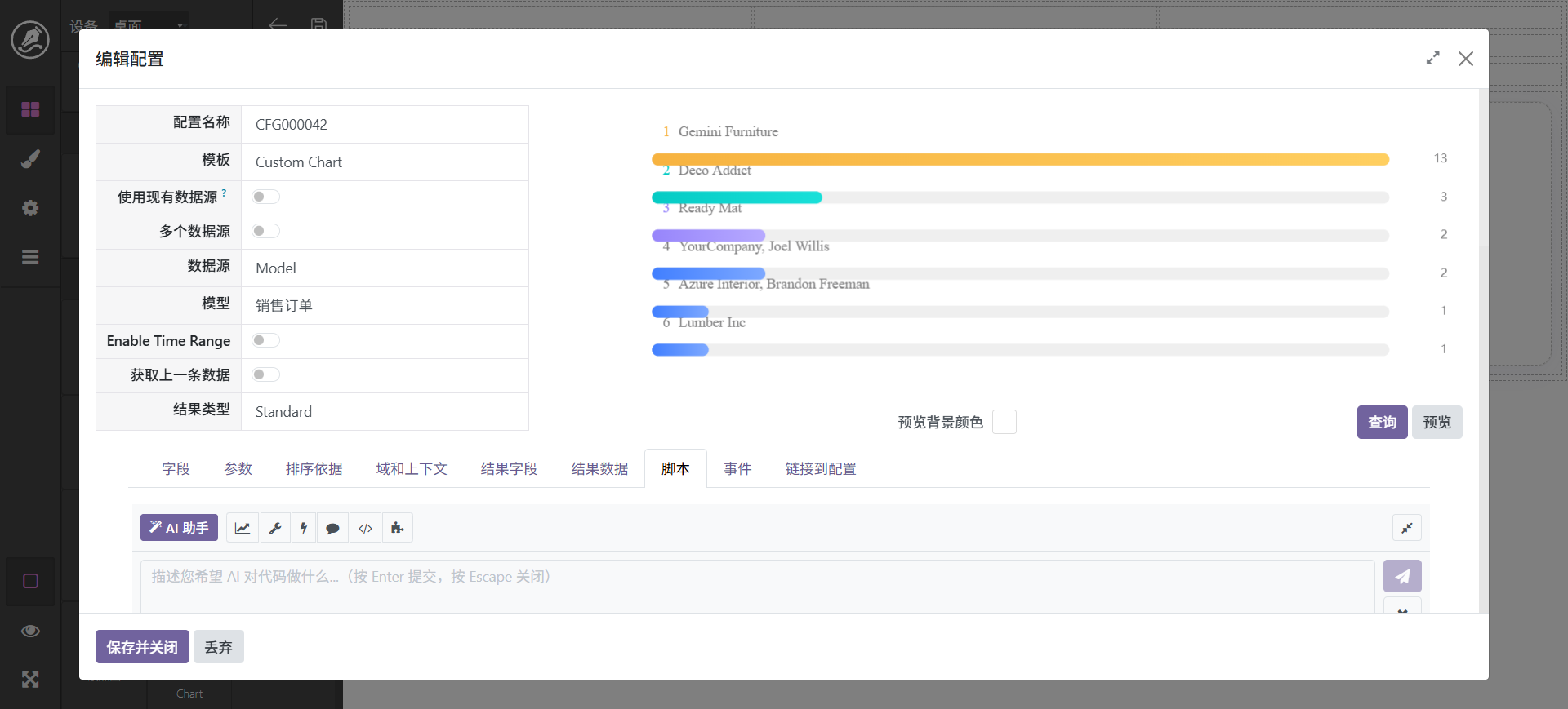 图表是看板中的重要组成部份,我们支持多种图表,大体分为系统固定图表和自定义图表,具体区别为,固定图表已经将脚本模式化,自定义图表需要将数据绑定到脚本,不过有ai辅助其实很简单,具体操作步骤如下: