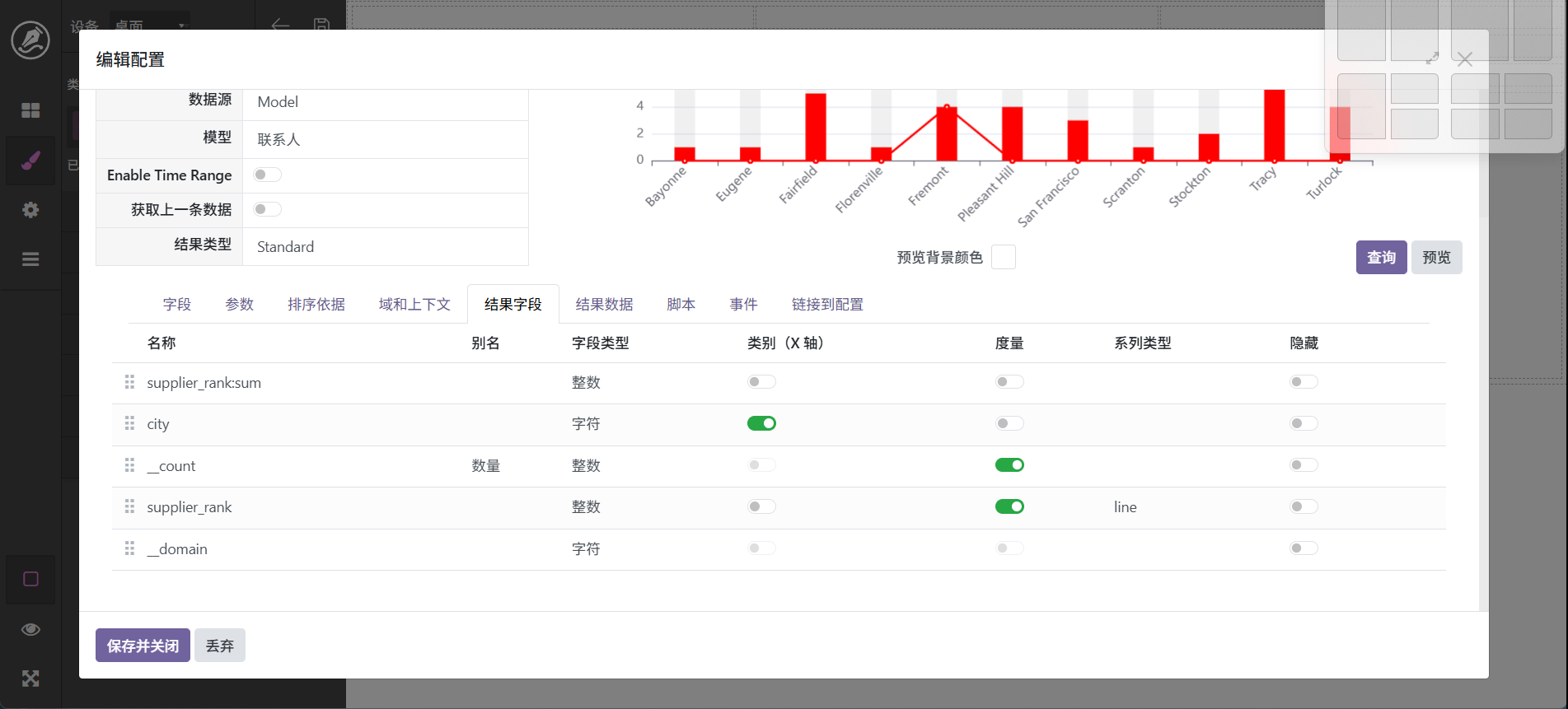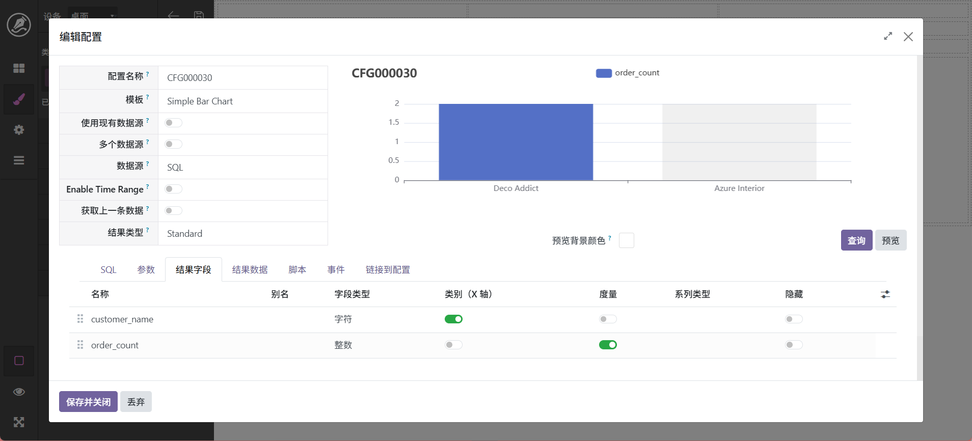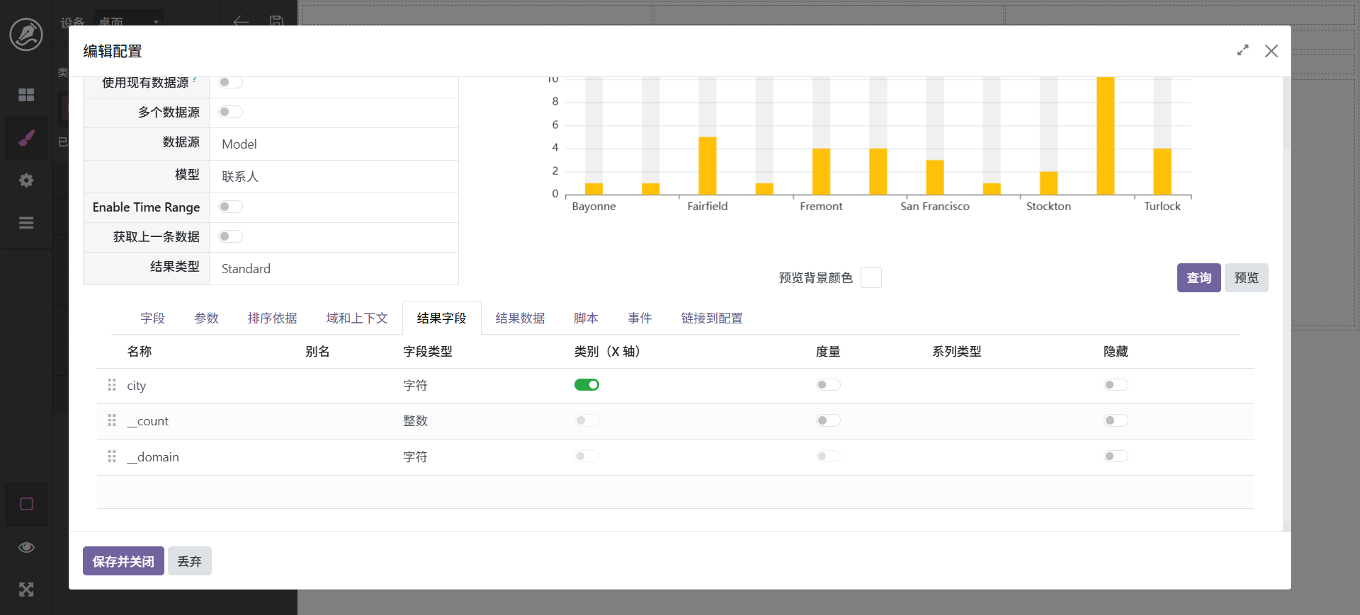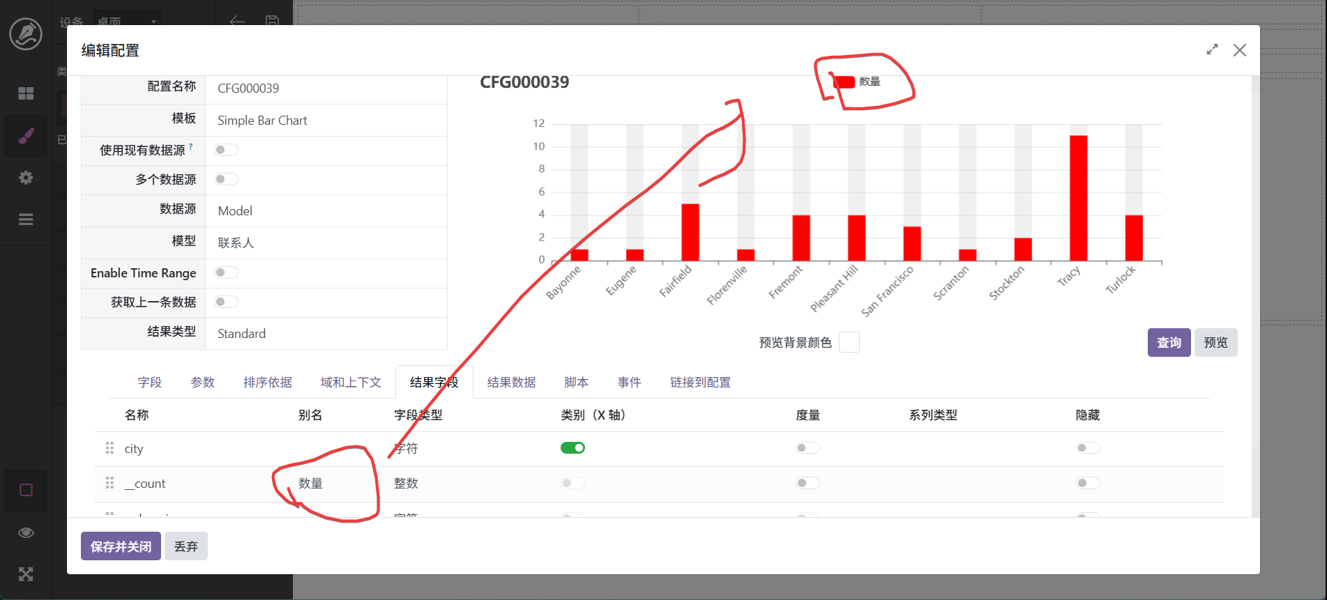 当然,也还可以进行其它调整,最终字段配置中可以设置字段别名,如_count可以显示为数量