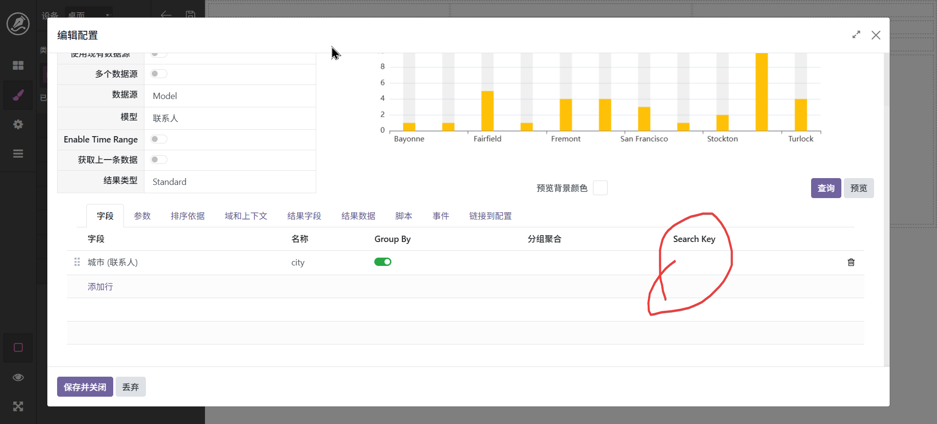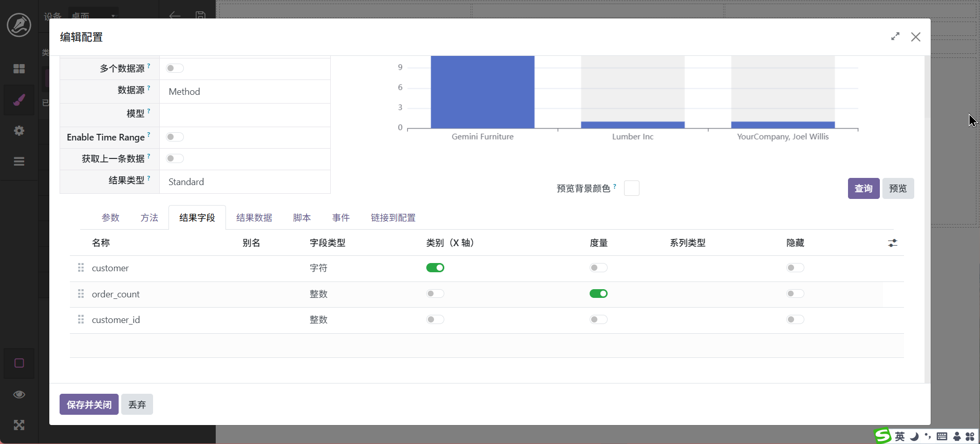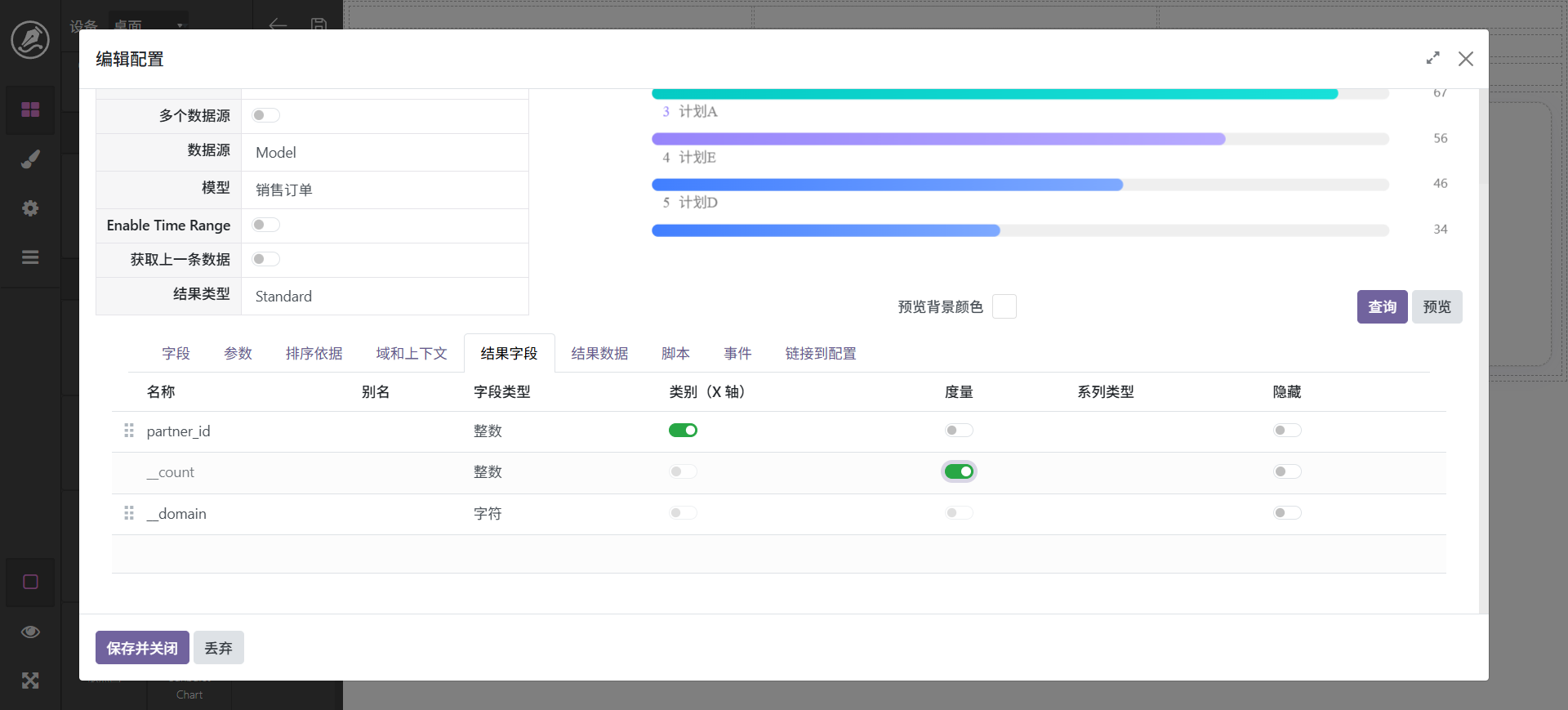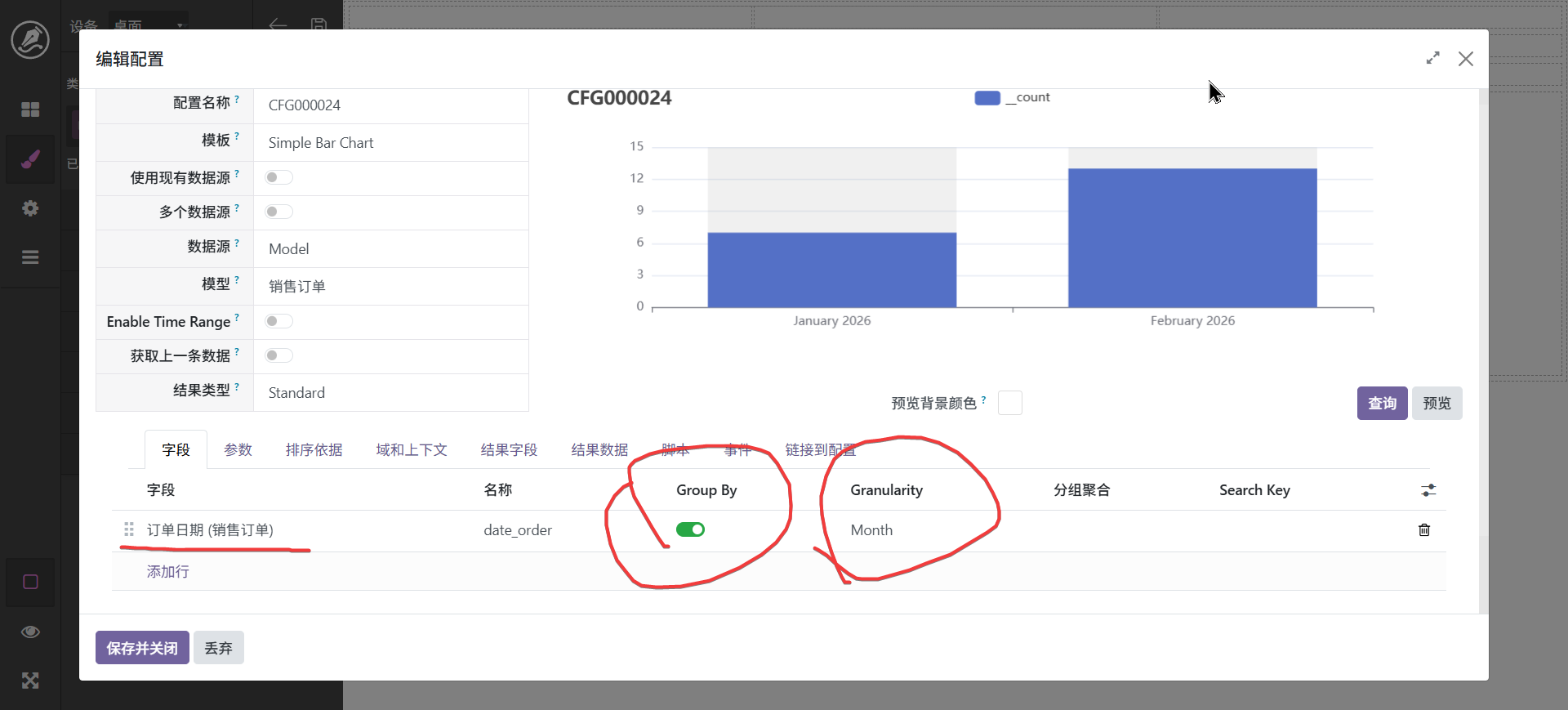 当然,也还可以进行其它调整,最终字段配置中可以设置字段别名,如_count可以显示为数量