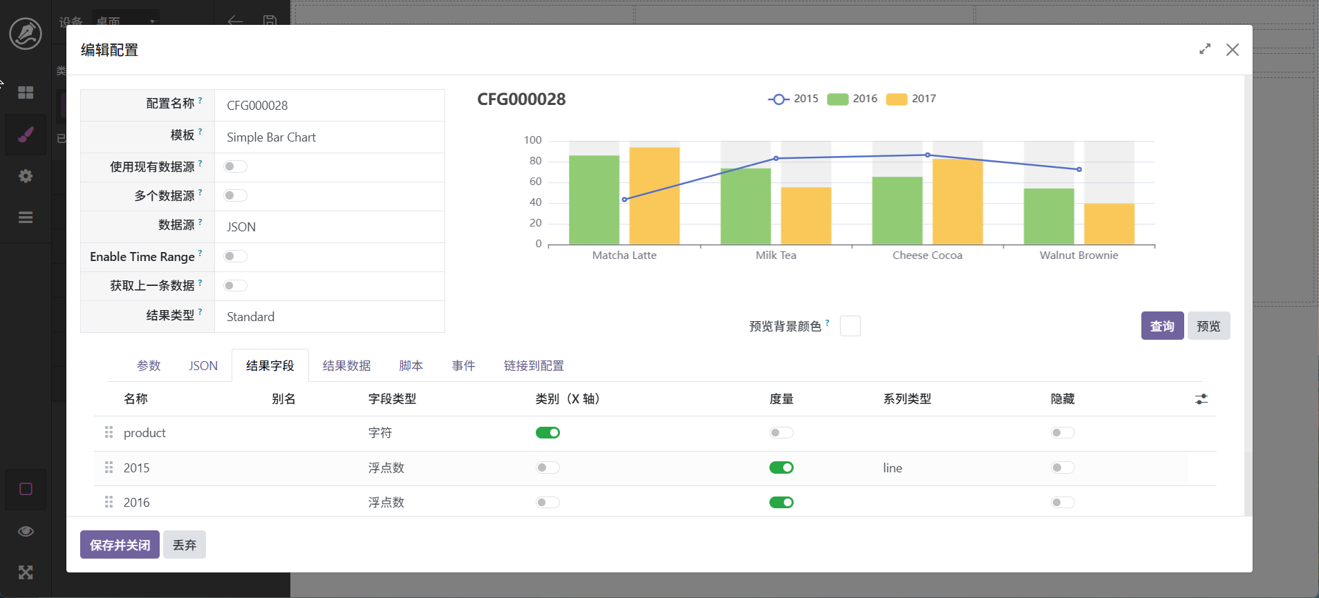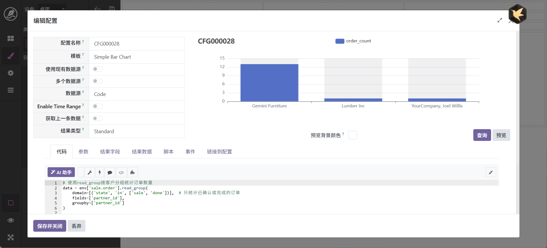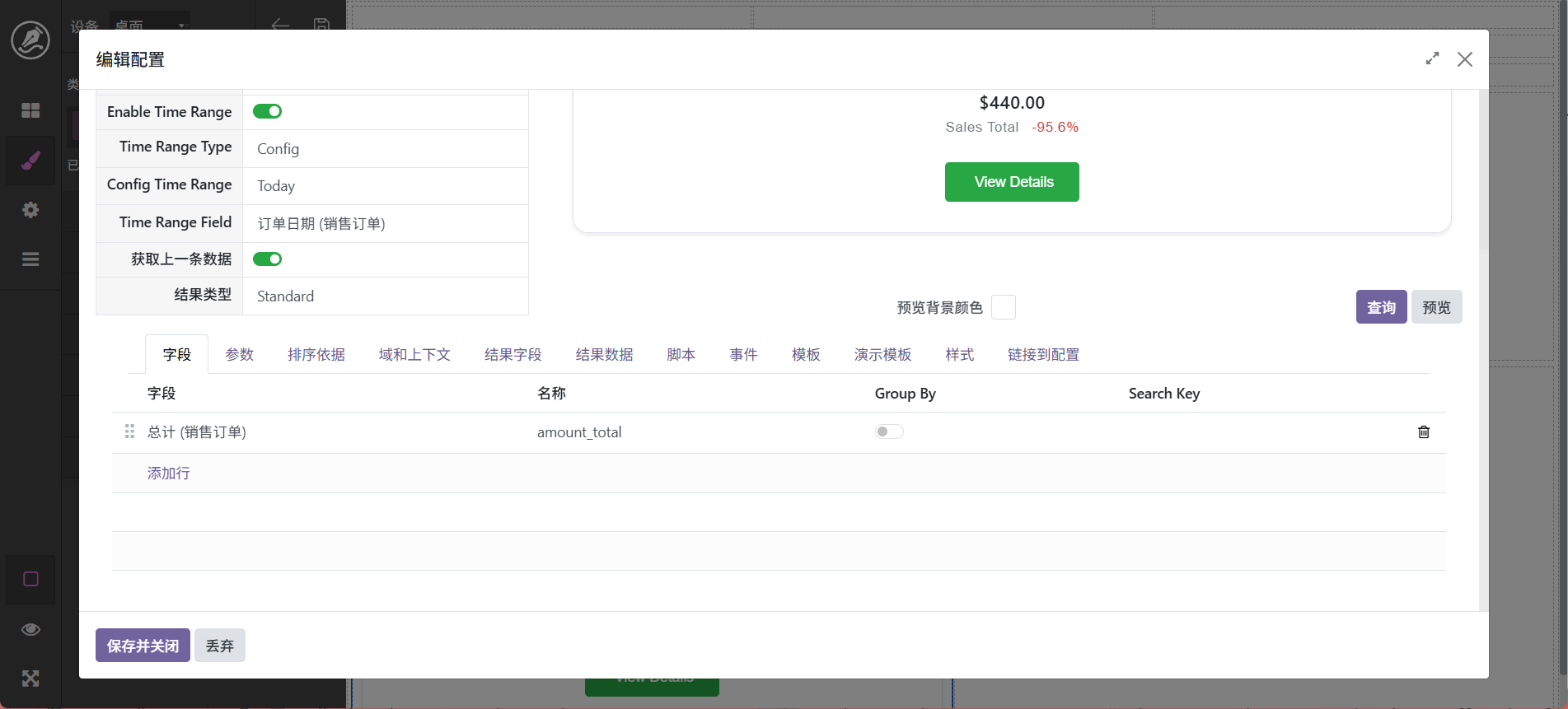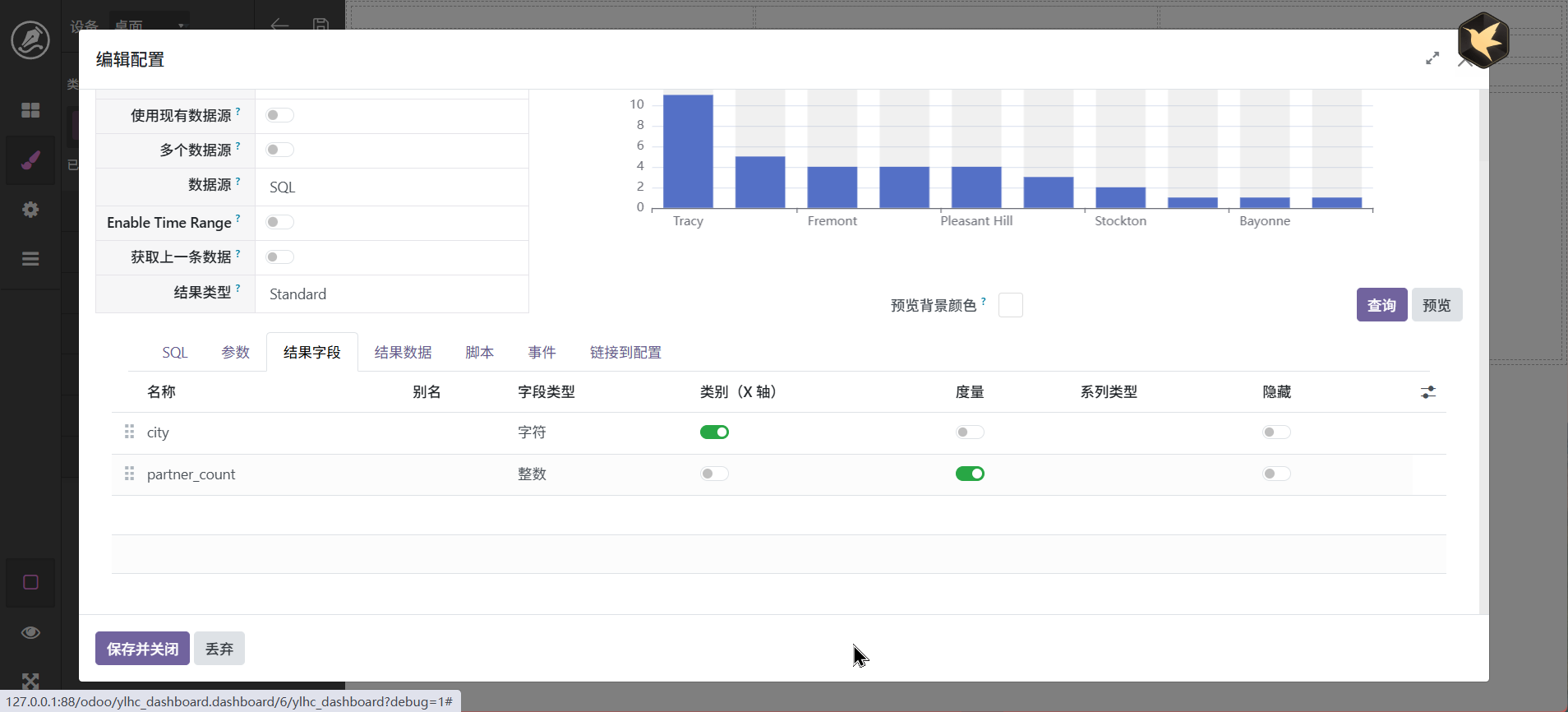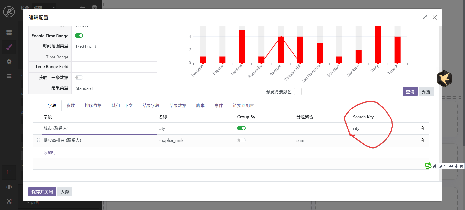当然,也还可以进行其它调整,最终字段配置中可以设置字段别名,如_count可以显示为数量