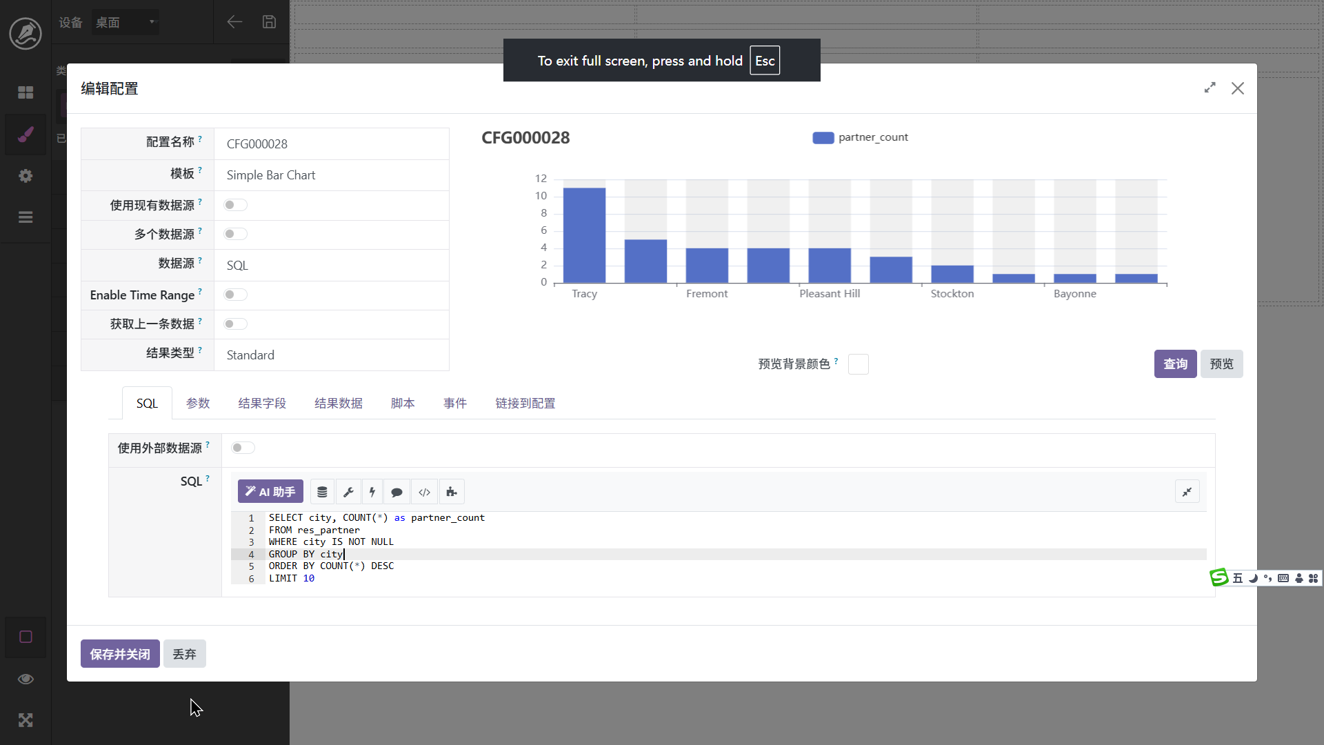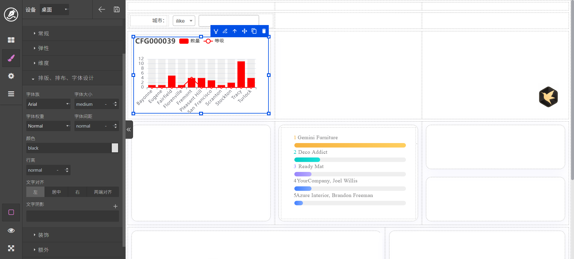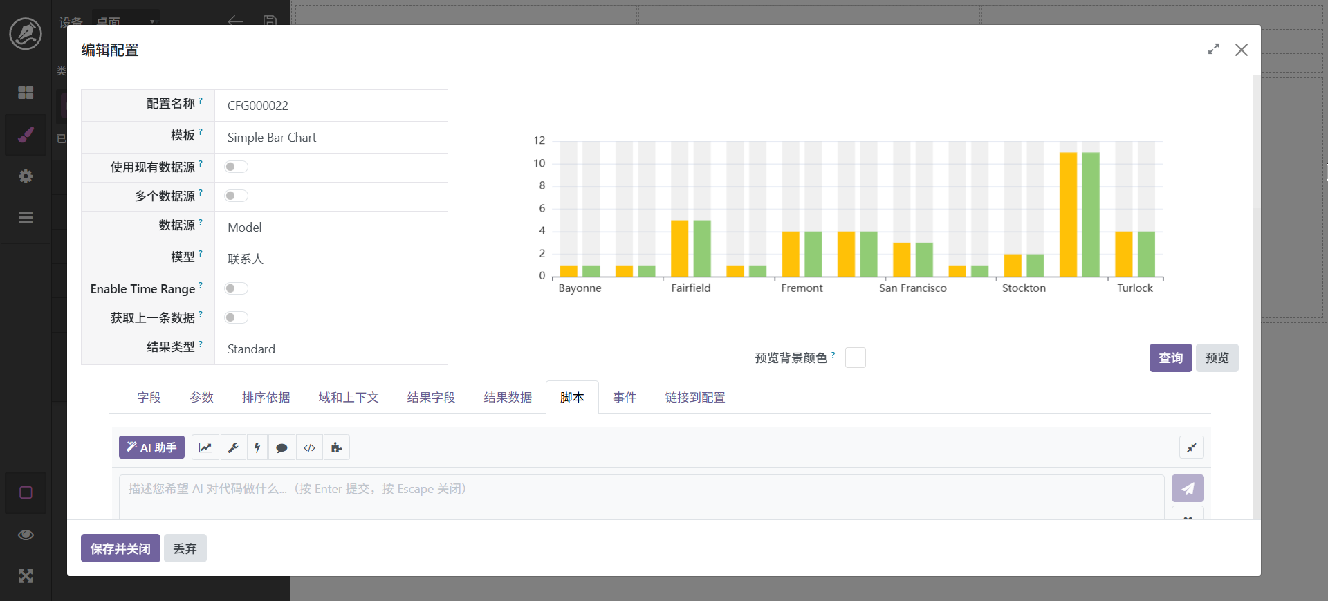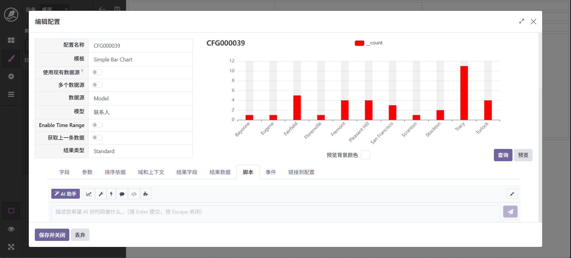 这里以城市为例进行分组。配置完成以后调击查询和预览,界面显示效果如图。如果要进行调整,可以在脚本页面使用ai进行调整,如: