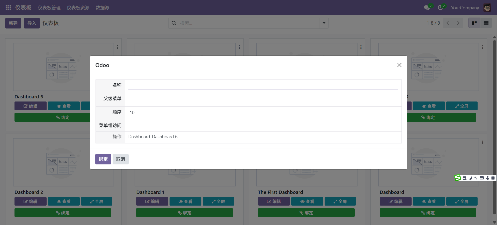 (4)、线定菜单,看板完成以后,往往需要绑定到菜单以后再进行查看。绑定菜单同时可以设置权限,具有权限的人才能查看看板。